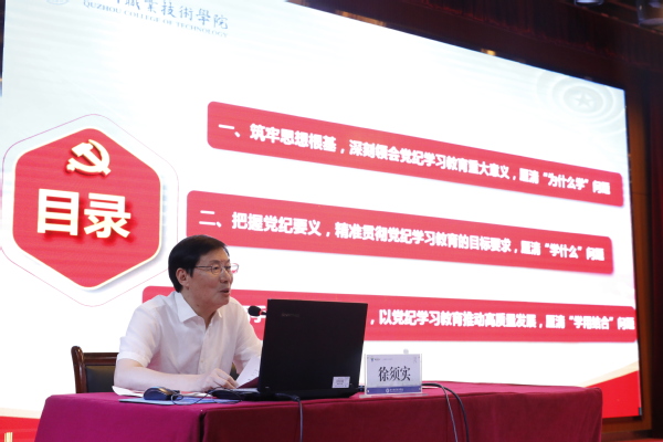 6月25日下午,我校组织开展党纪学习教育专题党课暨警示教育,党委书记徐须实作题为《正本清源服务立德树人、正风肃纪护航“双高”建设》的党纪学习教育党课报告,党委副书记、校长吕延文主持,党委副书记何百通,党委委员、纪委书记方焕云,党委委员、副校长余建军、徐浪静、姚水洪,党委委员、宣传部部长孔庆红,党委委员、组织部部长周帅出席。