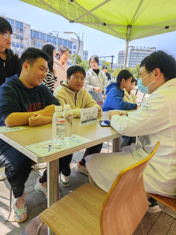 活动当天,从中午11:30 至下午 13:00,食堂门口热闹非凡。郑利锋主任和裴涵希医生凭借丰富的临床经验和专业知识,耐心地为前来咨询的师生们答疑解惑。无论是因学业压力导致失眠的学生,还是被工作生活琐事困扰睡眠的教职工,都在现场得到了专业的建议和指导。有同学表示,近期因课程作业和考试临近,常常辗转反侧难以入眠,经过郑主任的分析和建议,了解到了一些缓解压力、改善睡眠的有效方法,感到收获颇丰。